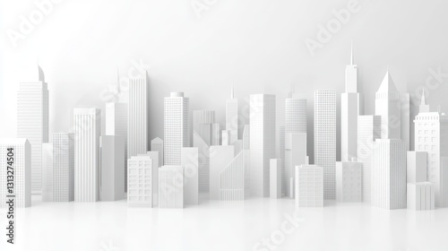Abstract city skyline, 3D model, minimalist, white background, design, architecture, graphic, illustration