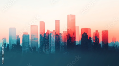 Abstract city skyline at sunset, blending colors and shapes for a modern aesthetic.