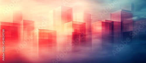 Abstract city skyline in vibrant red, orange, and blue tones, with foggy atmospheric effects and soft lighting, dreamy, futuristic ambiance