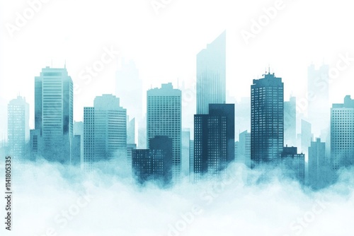 Abstract cityscape background with skyscrapers and fog, a blue-green gradient color on a white background.