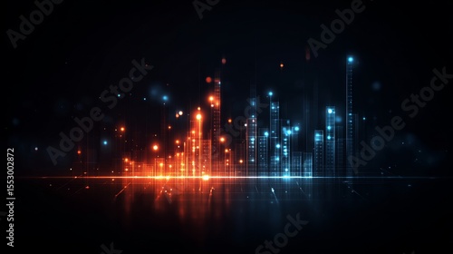 Abstract cityscape in glowing red and blue lines on black background.