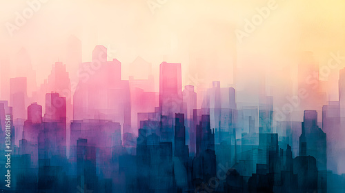 Abstract Cityscape with Colorful Haze and Urban Silhouettes