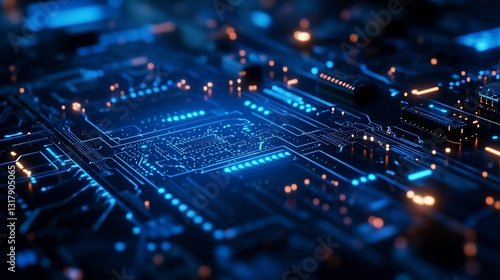 Abstract Closeup of a Futuristic Circuit Board with Glowing Blue and Orange Pathways Technology Innovation Digital World