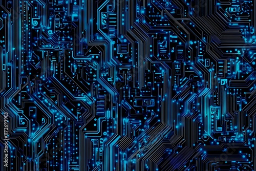 Abstract close-up of a glowing blue digital circuit board, showcasing intricate connections and technological design on a black background.