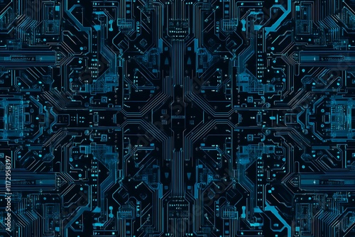 Abstract close-up of a glowing blue digital circuit board, showcasing intricate connections and technological design on a black background.