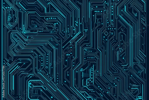 Abstract close-up of a glowing blue digital circuit board, showcasing intricate connections and technological design on a black background.