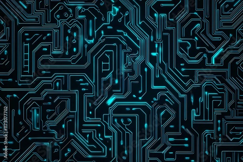 Abstract close-up of a glowing blue digital circuit board, showcasing intricate connections and technological design on a black background.