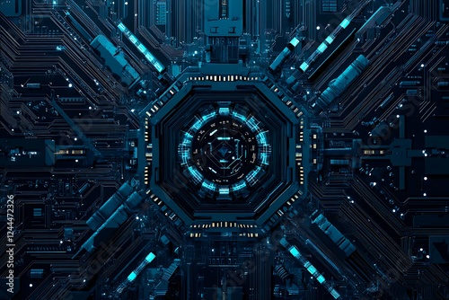 Abstract close-up of a glowing blue digital circuit board, showcasing intricate connections and technological design on a black background.