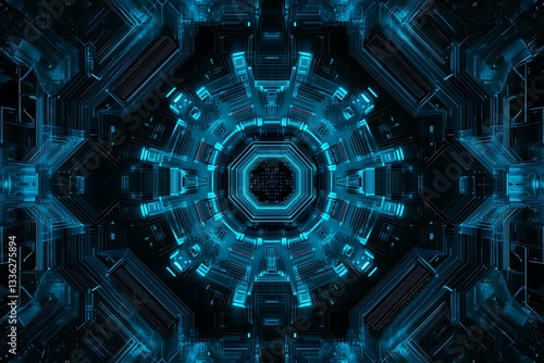 Abstract close-up of a glowing blue digital circuit board, showcasing intricate connections and technological design on a black background.