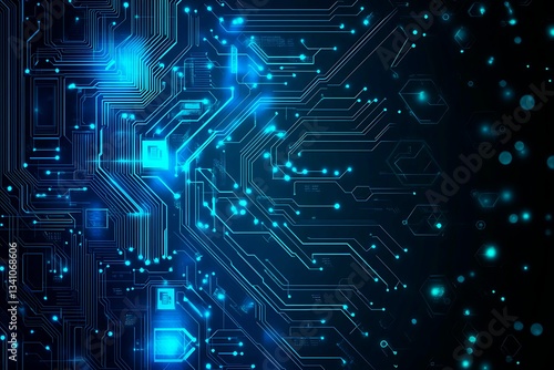 Abstract close-up of a glowing blue digital circuit board, showcasing intricate connections and technological design on a black background.
