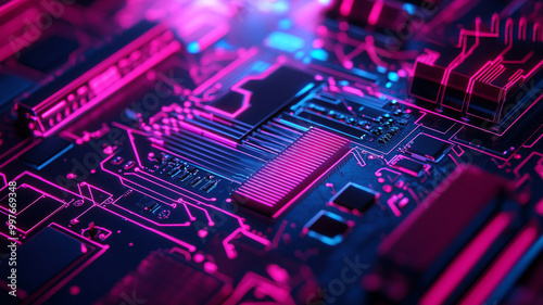 Abstract close-up of a glowing circuit board with neon pink and blue colors