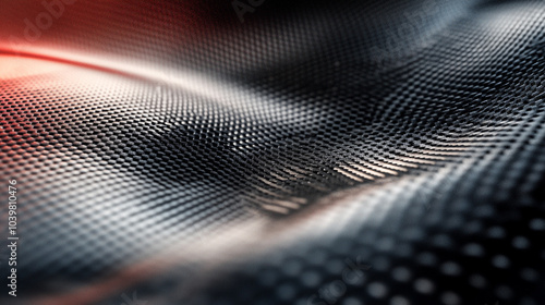 Abstract close-up of black textured fabric illuminated by soft red light at an artistic angle