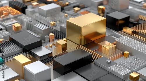 Abstract close-up of digital circuitry with metallic blocks in various colors and textures