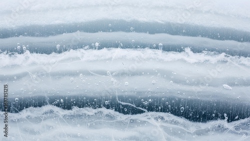Abstract close-up of frozen water with horizontal lines and bubbles creating a serene and textured natural background