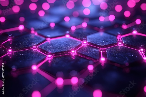 Abstract close-up of glowing hexagonal patterns with vibrant pink lights against a dark background