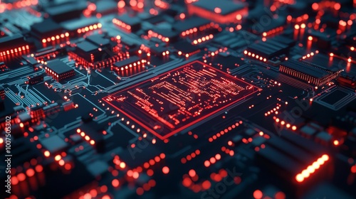 Abstract close-up view of a circuit board with red lights and intricate patterns.