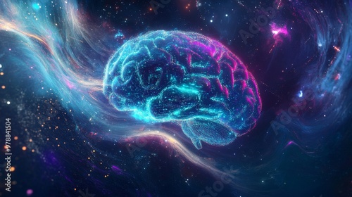 Abstract Cloud of Light and Data Particles Forming a Digital Brain in a Deep Space Scene with Galaxies and Nebulae