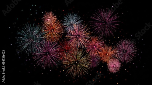 Abstract cluster of small colorful firework bursts in a scattered arrangement on black.