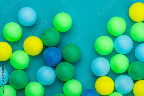 Abstract colored balls background. Multi-colored taw toy scattered on bright paper. Base for design nice backdrop, wallpaper, poster. Noisy surface texture