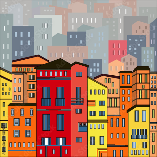 Abstract colored city view in outlines with many houses and buildings as a single piece. Cartoon style. Digital vector image.