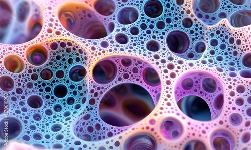 Abstract colorful 3D rendering of interconnected spheres forming a porous structure.