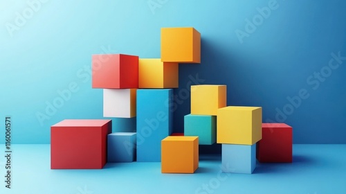 Abstract Colorful Blocks Composition: A vibrant 3D rendering of colorful cubes arranged in a playful, abstract manner against a light blue backdrop.