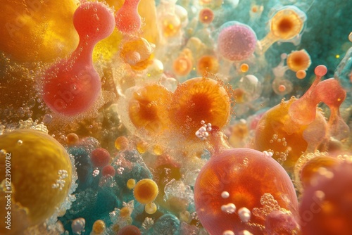 Abstract colorful bubbles in liquid form a vibrant, surreal landscape. Ideal for science, fantasy, or design projects needing a unique texture.