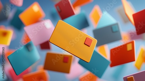 Abstract colorful cards float in mid-air, creating a vibrant, dynamic scene.