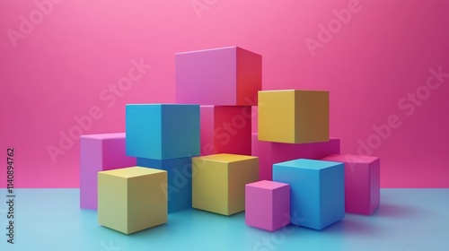 Abstract Colorful Cubes Composition on Pink and Blue Background