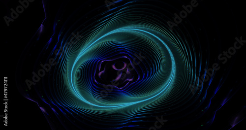 Abstract colorful glowing cyan and blue shapes form spiral. Fantasy fractal texture. Festive wallpaper. Computer creativity. 3D rendering.