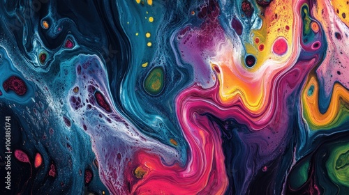 Abstract colorful liquid swirl painting with vibrant colors and dynamic shapes.