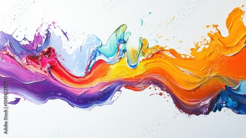 Abstract colorful paint waves form a sweeping, rainbow-like motion across a white canvas, showcasing vibrant energy and fluidity in this artistic capture.