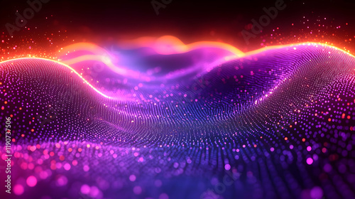 Abstract Colorful Particle Wave Background. Vibrant energy, dynamic motion, glowing particles, purple pink and orange gradient, futuristic technology