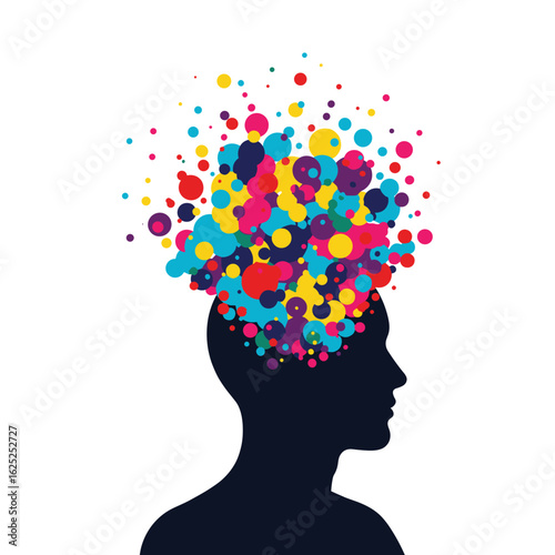 Abstract colorful particles exploding from human head silhouette brainstorming concept