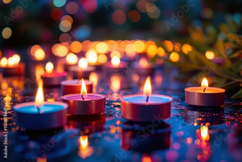 Abstract composition of glowing tealight candles with bokeh lights background.