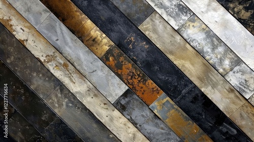 Abstract composition of metallic panels arranged diagonally, showcasing textures and colors