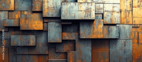 Abstract composition of textured metal panels in blue, orange, and brown tones arranged in a layered pattern, creating a dynamic visual effect.