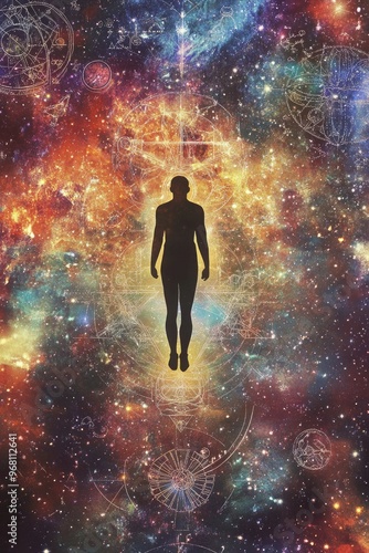 Abstract cosmic backdrop featuring stars and mystical geometric symbols with a silhouette of a levitating human figure
