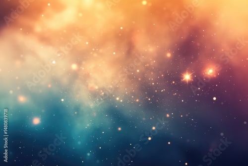 Abstract cosmic background with glittering stars and nebulae in teal, orange and purple hues.
