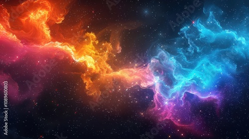 Abstract cosmic background with glowing nebulae in red, orange, blue, and purple tones with stars in a dark space.