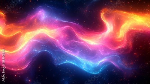 Abstract cosmic energy waves in vibrant blue, pink, and orange colors against a deep space background. Digital art illustration with glowing nebula-like textures.