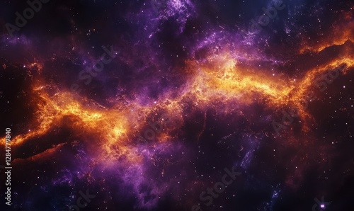 Abstract cosmic explosion of glowing light waves, rich purple and orange tones blending seamlessly into a vast dark universe,