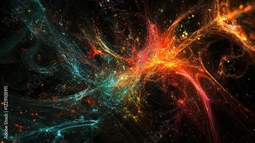 Abstract cosmic explosion with vibrant colors depicting energy and movement in a vast universe, showcasing intricate patterns and swirling designs in stunning detail.