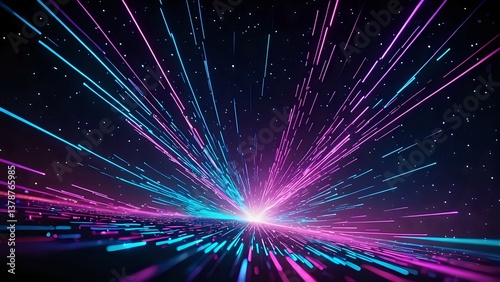 Abstract cosmic light streaks, vibrant neon pink and blue lines radiating from central point, dark background. Ideal for futuristic, technology, or energy concepts.