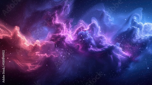 Abstract cosmic nebula with swirling clouds of gas and dust in shades of blue, pink, and purple against a backdrop of twinkling stars.