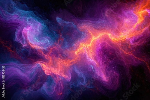 Abstract cosmic nebula with vibrant purple, pink, and orange hues swirling in a mesmerizing display.