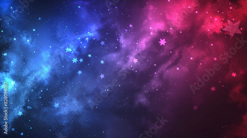 Abstract cosmic scene with a blend of blue and red hues, dotted with stars and nebula-like formations.