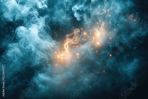 Abstract cosmic scene with teal smoke, golden sparks, and a dark background.