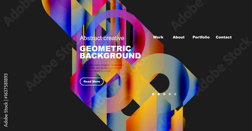 Abstract creative geometric background design. Vibrant colors, modern style, website header section with navigation elements. Includes button, text.