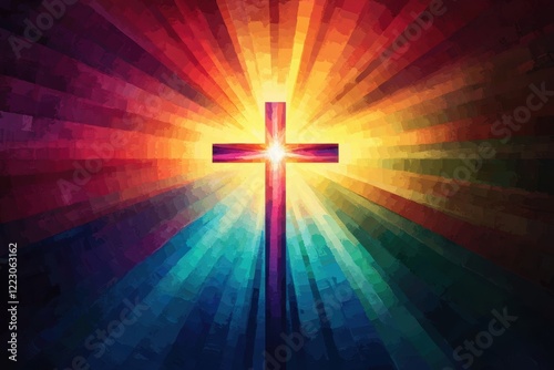 Abstract cross of Jesus Christ shines with the colors of light rays in rainbow hues, illuminating everything around it,represent Jesus' resurrection on Easter.